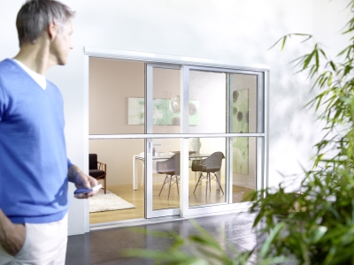 Kinderleicht zu bedienen, robust und schwellenfrei. Das plissierte Gewebe verschwindet bei Nichtgebrauch im Kasten.