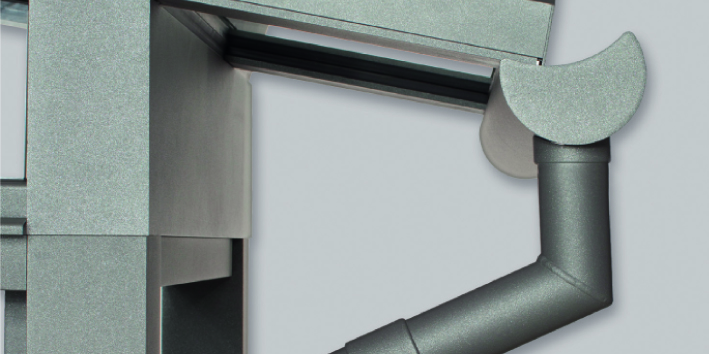 Die Systeme sehen verschiedene Formen der Entwässerung vor: über Wasserspeier, Kette, ein im System integriertes Fallrohr oder bei Dachüberständen möglich, ein Fallrohr aus Aluminium-Profilen - natürlich farblich abgestimmt. |