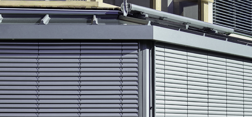 Außenliegendes Beschattungssystem aus auf die Profilfarbe abgestimmten Aluminiumlamellen für optimalen Sonnen-, Blend- und Hitzeschutz, Abdunkelung und Sichtschutz.